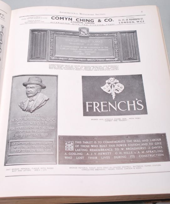 The Architects Standard Catalogues - 1939 - 1941. To include Volume I: Complete Indexes, Technical Information, Work and Fittings and Building and Decorative Materials, together with Volume II: Iron and Fireproof Construction, Ironmasonery, Joinery, Sanitary and Water Supply, Lighting and Fittings and Heating and  Ventilation. Each book is 9th edition. The catalogues detail architectural and building methods of the era and are suitable for historical archival research due to the listing of contemporary companies. Both are illustrated, some prints in colour. Published London.