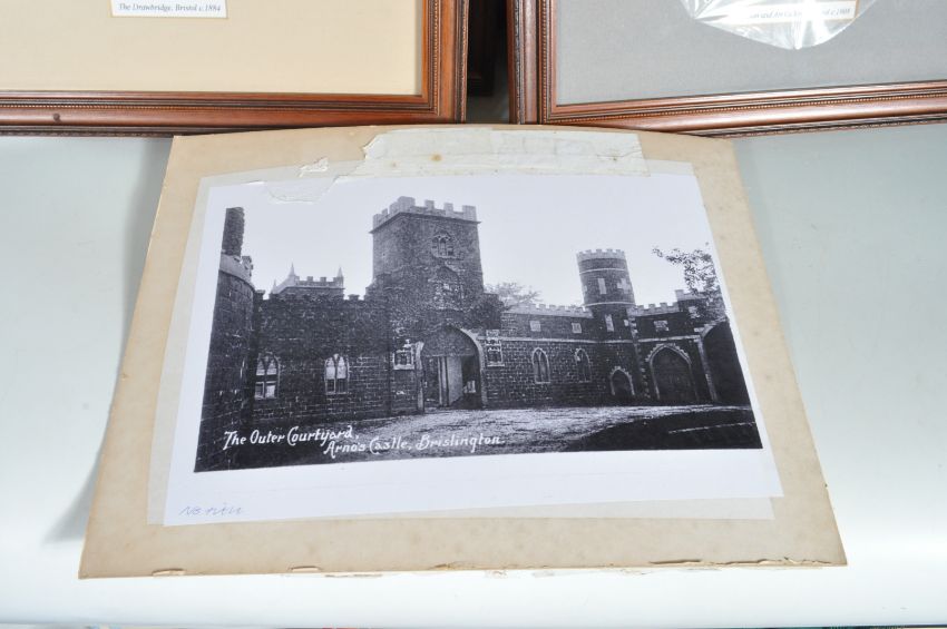 A group of Bristol local interest black and white framed photographs, each framed with notations including scenes of the Suspension Bridge, Museum and art gallery, the harbour, tramway centre and St Augustine's bridge. Measures 42cm x 37cm.