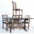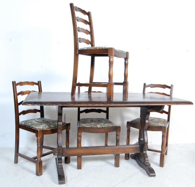 Retro vintage late 20th century Ercol style dining table and chairs having chamfered edges raised on old colonial style supports. The chairs having a ladder backs with panel seat raised on square tapering legs. Measures 75 cm H x 152 cm W x 81 cm D