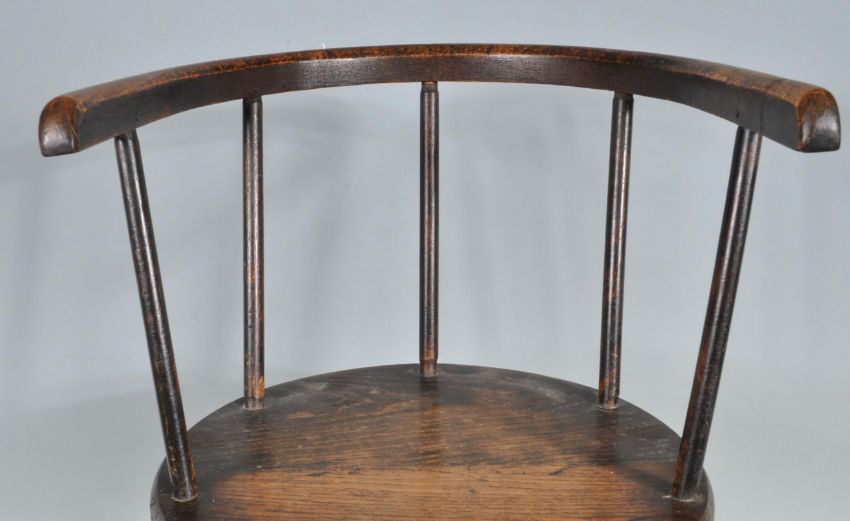 An early 20th century Georgian style oak children chair. The chair having circular seat with spindle back rest and curved top rail raised on turned supports united by turned stretchers. Measures approx.: 51cm tall.