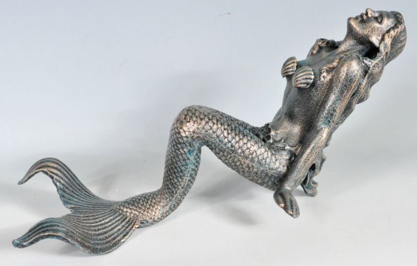 A vintage style 20th century cast iron statue of a seated mermaid in reflection. Measures 45cm high.