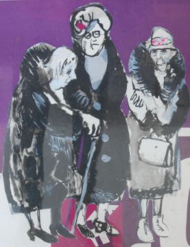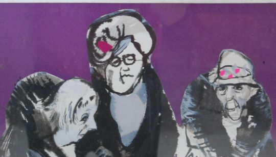 Anne Christie (b. 1939) - A vintage retro 20th century pictures collage and wash titled Three Old Ladies. The pictured depicting three old ladies dressed in black on a purple background. Signed by the artist to the lower corner. Note on the back mentioning the title, artist and gallery. Framed and glazed