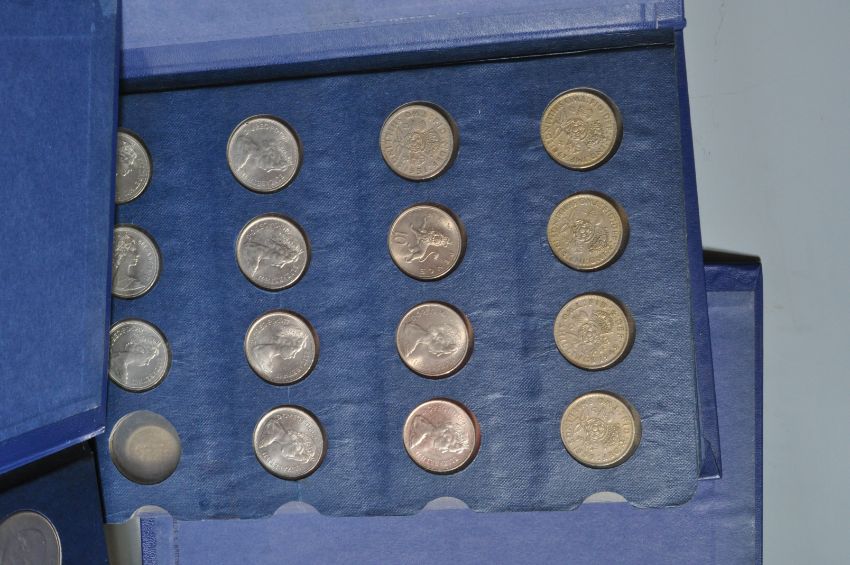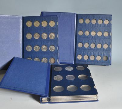 A large collection of approximately 261 mid century and later British and continental coins over three Coin Library albums. The collection include Crowns, Halfcrowns, Florins, Shillings, Six Pences, Brass Three Pence, Penny’s, Half Penny’s, and many more.