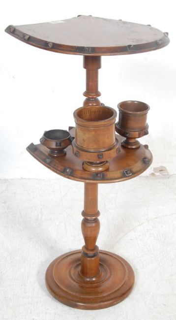 An early 20th century Edwardian walnut smokers table. The table having an unusual horseshoe to and undertray with turned pots / tobacco jars decorated with raised pyramidal motifs. The Babel being raised on a circular base. Measures 73 x 33 x 34cm