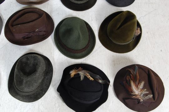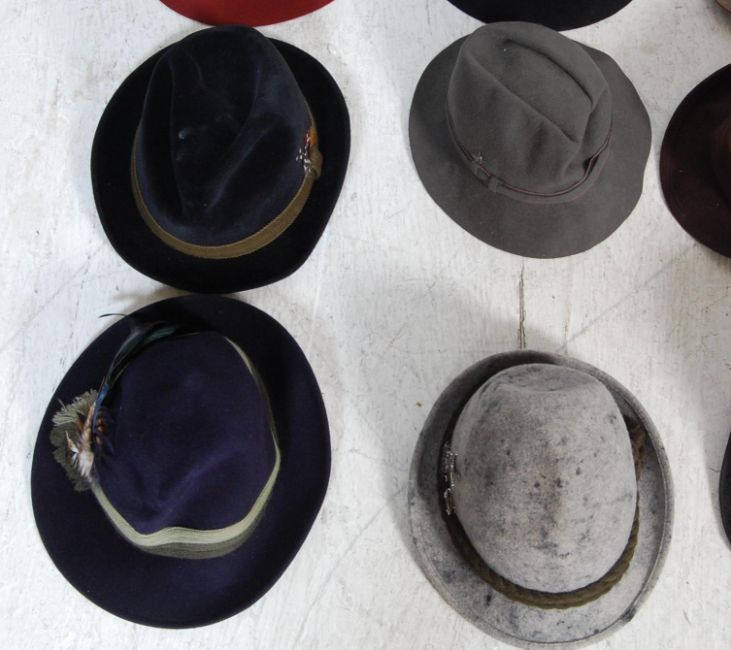A large quantity of vintage 20th century German Tyrolean / Alpine / Bavarian hats comprising of examples in green, blue, red, black and other colours. Some examples have feathers to the brim. Brands include Antone Pilcher Gras, La Mouche, FX Hillebrand and many more,