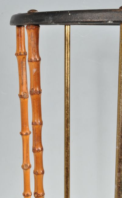 A vintage retro mid 20th century antique style cast iron and bamboo stick stand / umbrella stand. The stand having four bamboo columns and two brass columns united by cast iron oval ring to the top and cast iron dripping tray base to the bottom. Artis Birmingham makers mark to the underside.Measures, 50 cm Tall