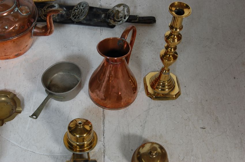 A collection of vintage 20th century brass and copper items comprising of a coal scuttle, charger, kettle, horse brasses, candlesticks and more