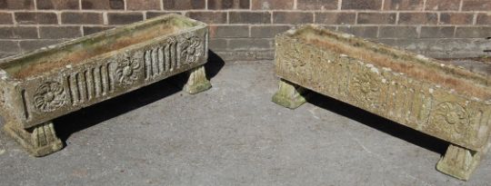 A pair of 20th Century well weather reconstituted garden planters of rectangular trough form, decorated with moulded floral motifs raised on block supports