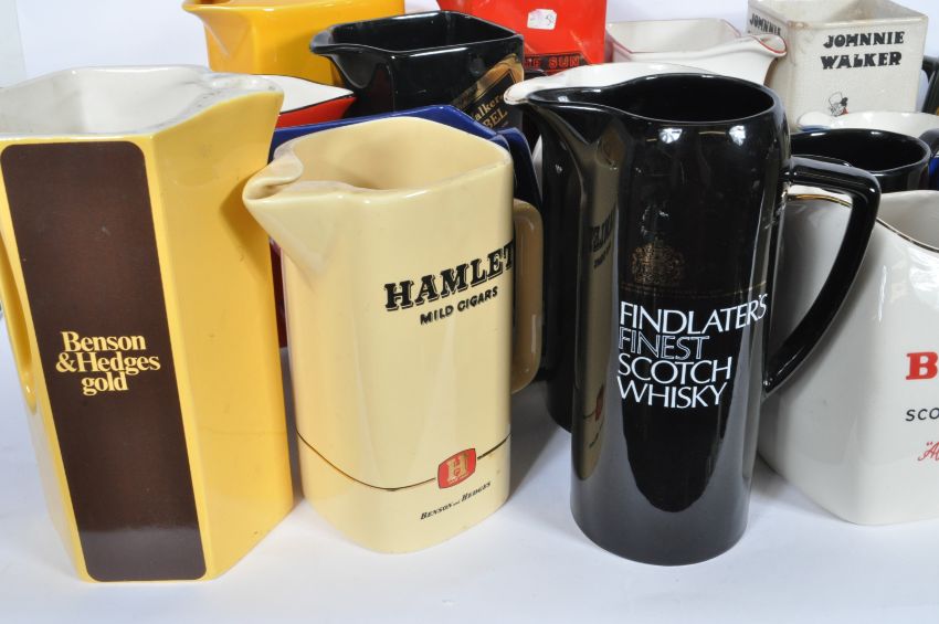 A large collection of approximately 32 vintage 20th century pub advertising Whisky jugs to include Teachers - This Is The Truth, Robert Burns, two ashtray, Crabbie, Crawford, Bells, Old Parr, Glenfiddich, Bells Decanter, Grants, Paddy Irish, etc. Measures approx.: 51cm tall.