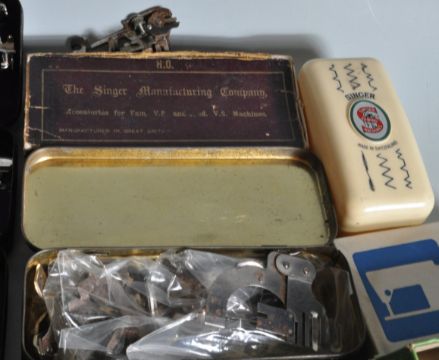 A collection of vintage 20th century sewing machines accessories for Singer to include contents within  metal tins, cardboard, plastic and more. All with contents inside.