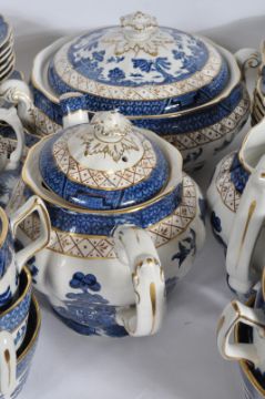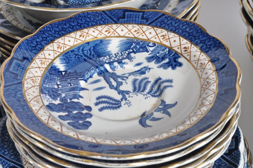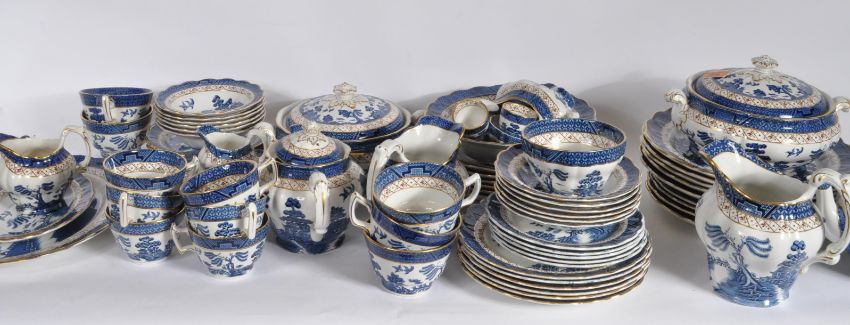 A large and expensive Real Old Willow blue and white ceramic dinner service comprising of various sizes plate, soup bowls, graduating jugs, coffee cups, tea cups, saucers, side plates, creamer jug, sugar bowl, oval platers, tureens, etc. All being decorated with Chinese oriental landscape scenes. Makers mark to the underside. Measures: larges plate in diameter is 27cm diameter. Condition: good collection over all, some minor chips on some of the plates but nothing major.