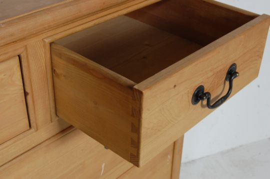A Victorian style pine chest of drawers. Raised on bracket feet with 2 short over 3 deep configuration having brass swing handles, caddy top above