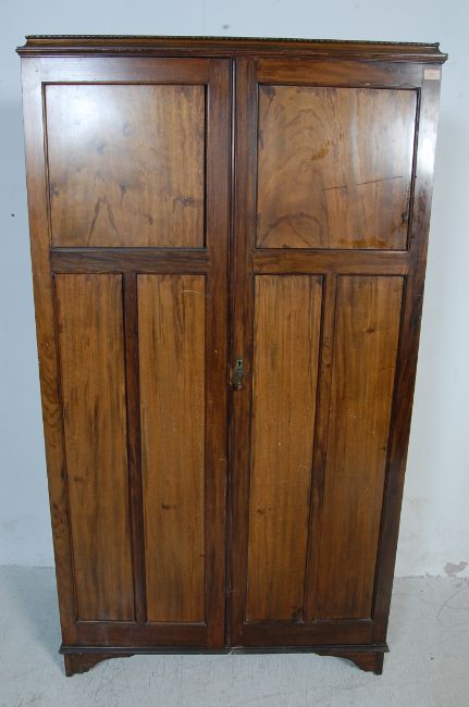 A mid 20th century antique style walnut compact wardrobe. The twin door wardrobe having panel doors with brass lock, fitted interior raised on bracket feet. Measures approx.: 183 cm H x 101 cm W x 48cm D.