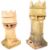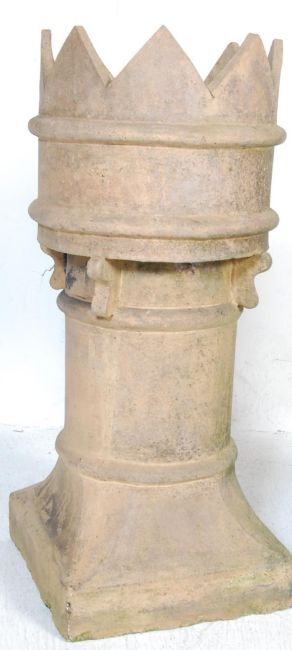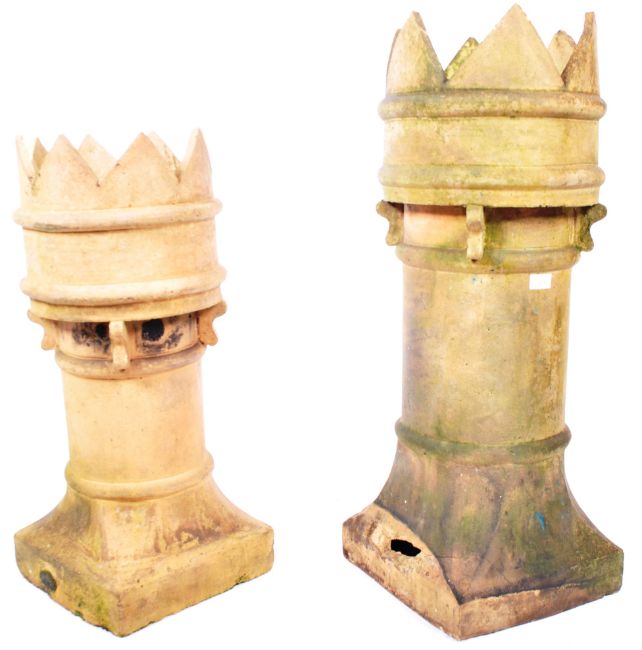 A graduating pair of antique 19th Century Victorian English pale stone chimney pots / garden planters / ornaments. Each having crown tops with cylindrical centres raised on canted square bases. Biggest measures 91cm x 33cm x 35cm.