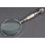 A 20th Century desktop magnifying glass having a large round lens set within white metal set with a mother of pearl handle. Measures 25cm.