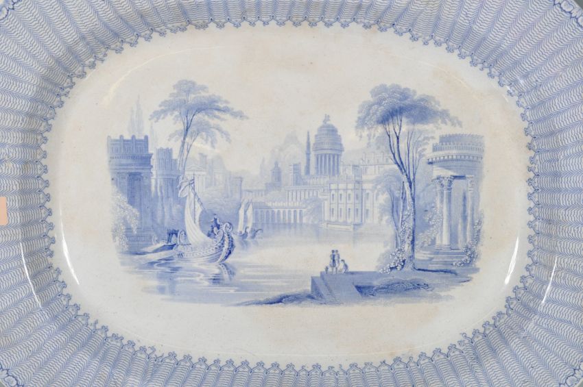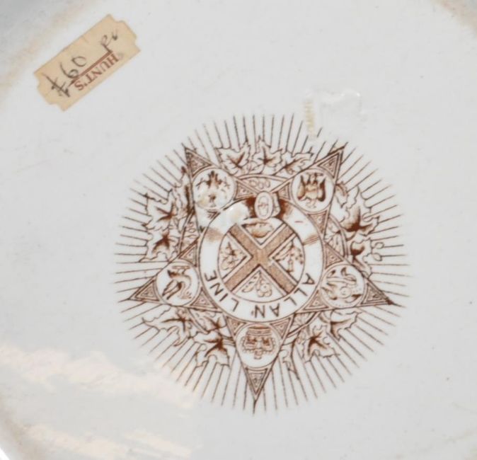 A pair of 19th century Victorian blue and white Ashworth Bros Royal Stone China “ Allan Line “ ocean liner soup bowl circa 1860 - 1880 having Chinese decoration to the centre along with a Samuel Barker Ironstone China blue and white plate with rare mark circa 1850 and a large blue and white meat plate / plater. Measures approx.: 50cm H x 40cm W.