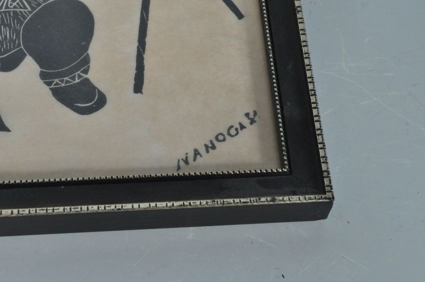 A pair of late 20th Century Canadian Inuit art block prints by Agnes Nanogak (12 November 1925 – 5 May 2001), one depicting the butchering of a seal, the other depicting a figure eating fish. Both signed within the print. Framed and glazed. Measures 24cm wide.