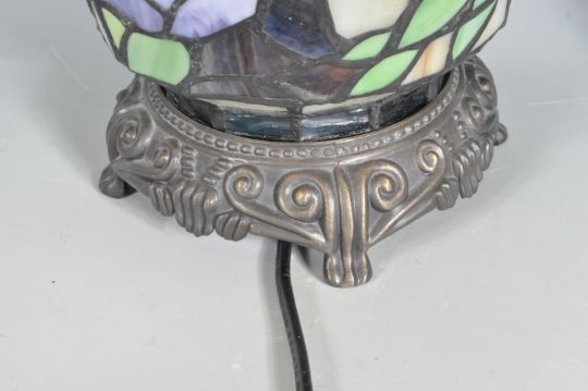 A set of three vintage 20th century Art Nouveau Tiffany style lamps comprising of two desk bedside lamps having naturalistic basses with overhanging shades together with an uplighting conical shaded lamp. Measures 40cm high