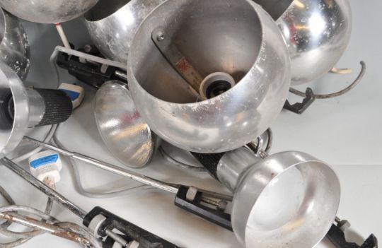 A group of vintage retro 20th century polished aluminium lights to include spherical shade light and conical light shade lights with clamping body. Condition: scratches on all thighs. Very well used lights. Measures: 20cm long the conical shade.