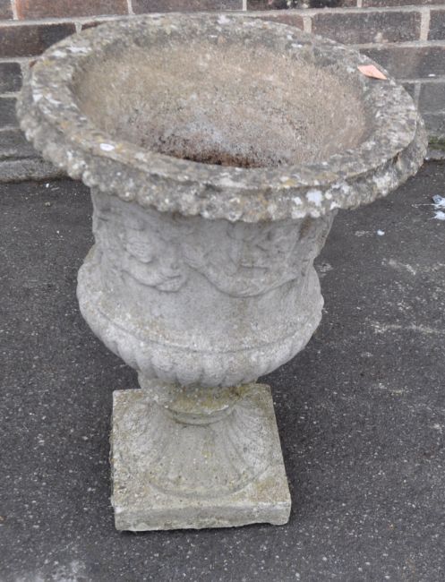 A 20th Century antique reconstituted stone garden planter / pot of goblet form having flared rims with moulded geometric decoration panels to the bowl, raised on columns with square bases.Measures, 65 cm H x 46 cm W Diameter