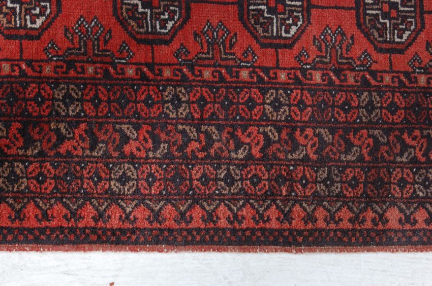 A late mid 20th century Bordjalou Kazak Southeast Caucasian carpet rug runner having multiple hexagonal shaped medallion to the red field with Caucasian symbols motifs surrounded by multiple borders with floral motifs and white fringes to each end. Measures approx.: 270cm long x 87cm wide.