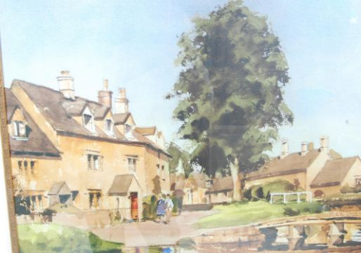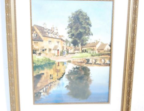 R. Hartley - A pair of signed and numbered watercolour painting picture prints being set within decorative gilt frames with white borders and being glazed. One print depicting a river running along the side of a village on a cloudy day (numbered 79/195) with the other depicting a pond scene with figures present (numbered 56/195). Average size 77cm x 96cm.