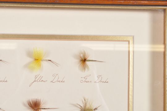 Two vintage retro limited edition fishing interests frame and glazed fishing hooks to include: White Drake, Yellow Drake, Green Drake, Spent Grat, Brown Drake, French Partridge, Black Doctor, etc. All set in a glazed picture frame. Measures approx.: 31 cm high x 38cm wide (largest frame)