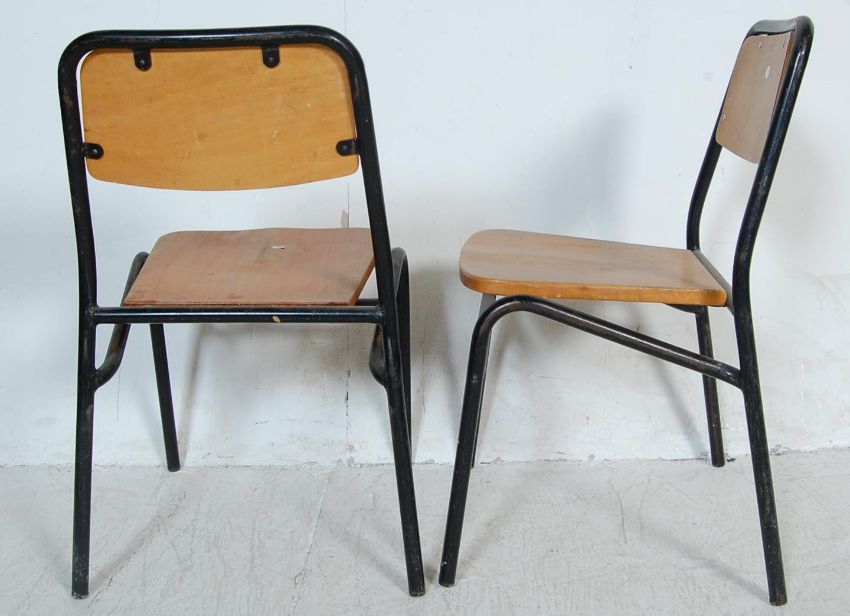 A set of six retro vintage industrial school chairs having plywood backrests and seats raised on black tubular supports. Measures 74 cm H x 32 cm W x 37 cm D