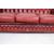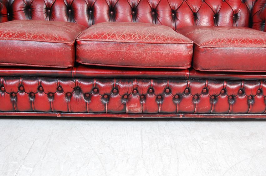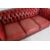 A vintage 20th Century antique style Chesterfield three seater sofa settee in a deep oxblood scarlet red leather having button back, detachable cushions seats with buttoned scrolled arm rests raised on casters. Measures  63 cm H x 190 cm W x 85 cm D