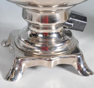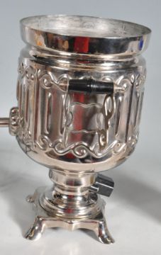 A vintage 20th century antique style Russian Samovar water boiler having twin handles, detachable lid raised on a square plinth base complete with original box and instructions. Measures: 35cm tall.