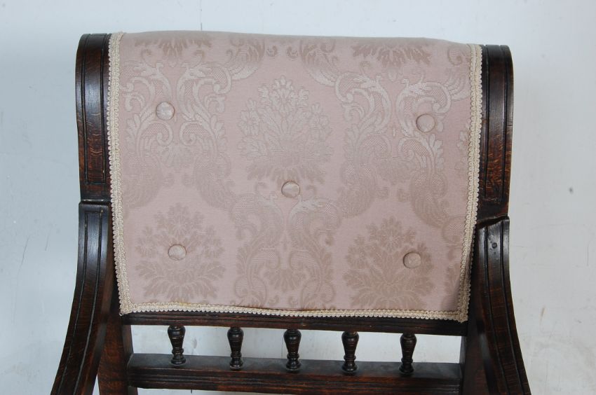A late Victorian 19th century mahogany nursing chair having shaped arm rests with a button backrest over a turned gallery backed overstuffed seat raised on turned legs with casters. Measures approx.: 72cm H x 49cm W x 47cm D.