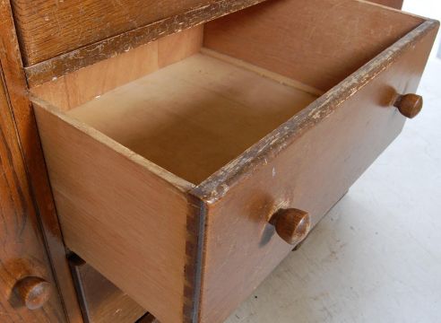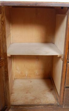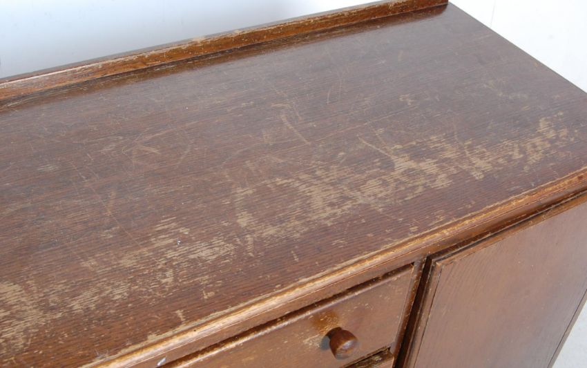 A mid 20th century oak sideboard. The sideboard having a bank of four drawers with knob handles flanked by cupboards fitted with shelves raised on a plinth base. CC 313 mark to the inside.