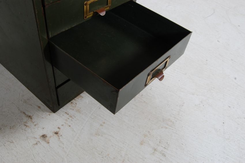 A pair of vintage retro mid 20th century factory industrial metal desk top filing cabinets. The multi drawers cabinets of a rectangular form. One with brass handles and one with chrome handles. Both painted in green. Measures, 41 cm H x 28 cm W x 37 cm D