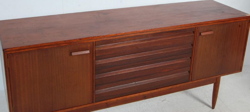 A vintage retro 20th century Danish inspire teak wood sideboard credenza. The sideboard having a bank of four drawers to the centre flanked by two single door cupboards raised on tapered supports. Measures, 77 cm H x 168 cm W x 46 cm D