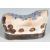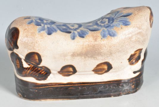 A Chinese oriental ceramic cizhou style pillow in a form of a cat. The cream glazed pottery is stylistically modelled as a recumbent cat, decorated with dark brown patches and details, the back with blue enamelled flowers. Measures, 26 cm Long