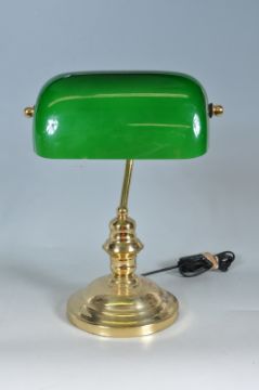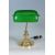 A 20th Century vintage bankers desk / table lamp light of brass construction having an adjustable green glass shade supported by two brass arms united by a single stem column. Raised on a circular stepped base. Measures approx.: 38cm tall.
