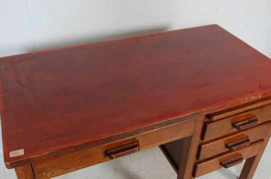 A vintage retro mid 20th century Air Ministry style desk / industrial desk having a rectangular form with single drawer to the frieze and a bank of three drawers to the right with block handles raised on square legs. Measures, 74 cm H x 114 cm W x 61 cm D