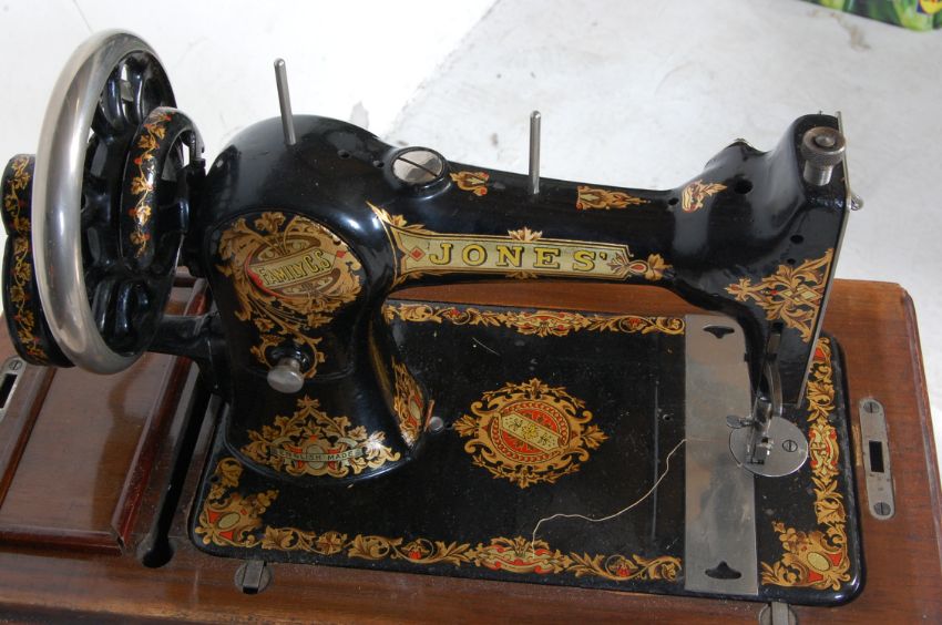 Two antique early 20th century sewing machines of decorative form comprising of a Seidel and Naumann hand crank sewing machine having an ebonised frame, brass plaque raised on an inlaid Walnut burr base. Serial number 1949287. Comes with oak carry case. Together with an antique early 20th century Jones CS / Cylinder shuttle sewing machine having a black ebonised decoration with gilt embellishments. Serial number 311579. Raised on a plinth base with wooden carry case. Comes with key and accessories.