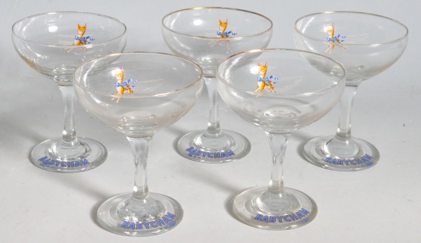 A set of five retro vintage Babycham glasses / cocktail glass of usual form with babycham logo printed on the side raised on circular foot.