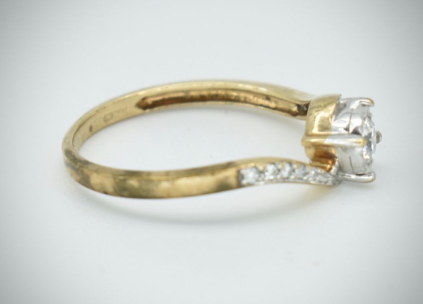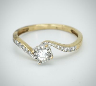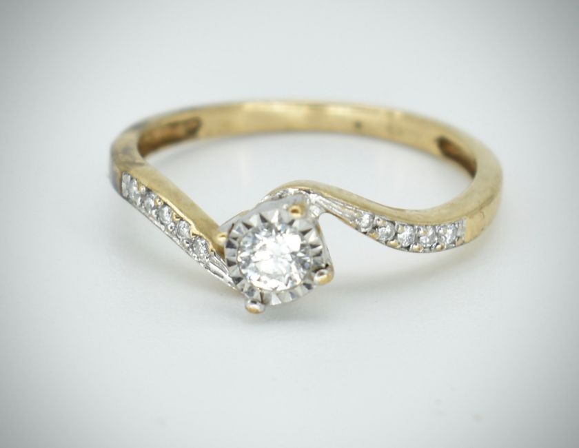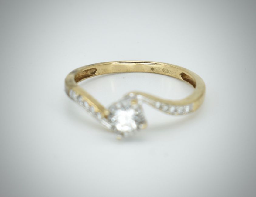 A 9ct gold / 375 marked single stone diamond ring. The ring with central round brilliant cut stone with accented diamond shoulders. Estimated diamond weight approx 0.25cts. Marked 375, sponsors mark WJJ. Total weight 1.94g / Size P