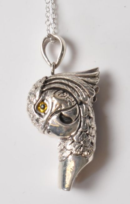 A stamped sterling silver necklace having a whistle pendant in the form of a parrot with amber glass eyes and engraved features. Attached to a tracer chain stamped 925 silver. Total weight 21.6g. Chain measures 42cm length.