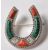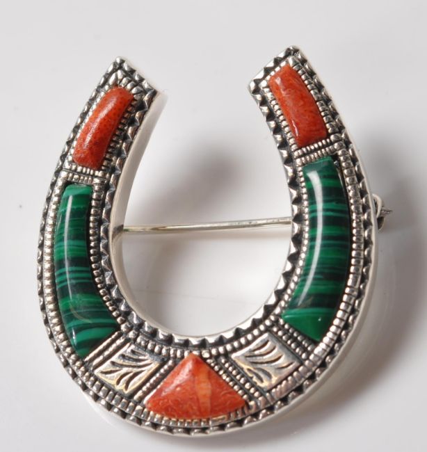 A stamped sterling silver brooch in the form of a horseshoe having an engraved border and faux agate panels. Stamped sterling to the back. Measures 32mm x 30mm. Total weight 9.3g.