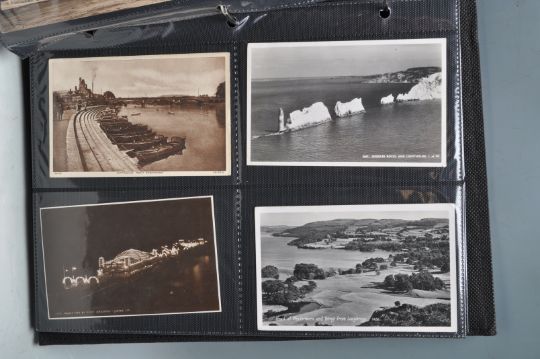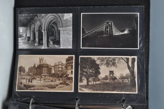 A collection of mostly early 20th Century Edwardian and later postcards across two albums containing mostly black and white photographic views, subjects to include some local interest scenes of Bristol including the suspension bridge, St Mary Redcliffe church, Bristol Cathedral, Cabot tower, and some West Country scenes including Somerset, Cheltenham, Dunster, Bath, Stone Henge etc. Also includes a good selection of London postcards in the second album and two embroidered examples.