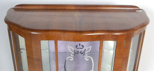 A vintage mid 20th Century figured walnut china display cabinet having glazed doors with silver detailing, swing door with lock to the front and glass panels to the sides, all raised on cabriole legs.