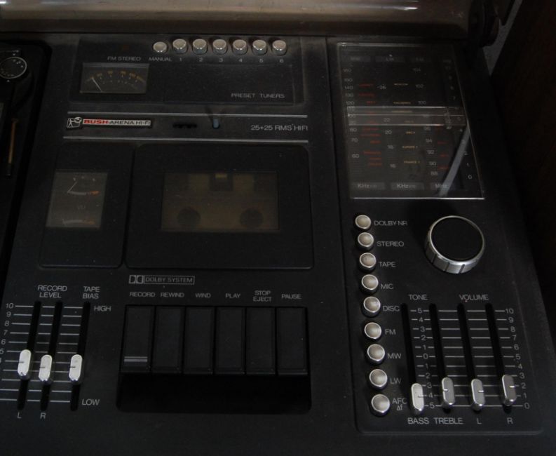 A vintage Bush Arena hi fi Dolby System record player / cassette player / radio unit together with a pair of Bush teak cased speakers.