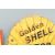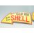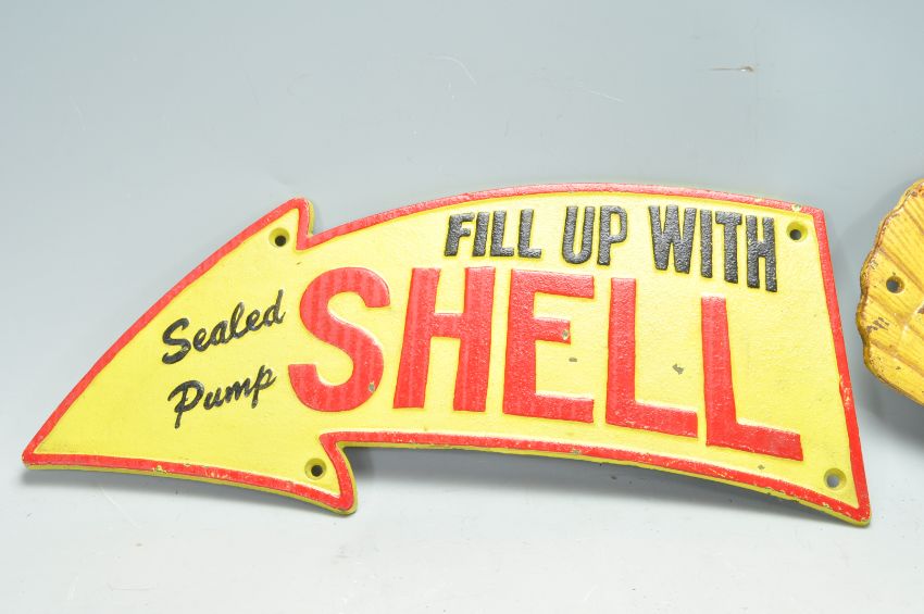 Two vintage style cast iron advertising point of sale advertising plaques / signs comprising of a arrow shaped sign for Shell having the iconic red and yellow colour scheme together with a Golden Shell motor oil sign.  Largest measures 14cm x 40cm.