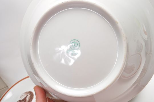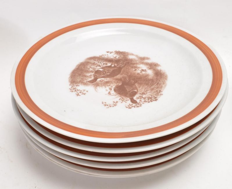 A vintage 20th Century Eastern European / Russian dinner set having brown hunting interest animal scenes to the plates with brown rims, includes dinner plates, large bowl and a tureen. Marked in green to the base.