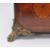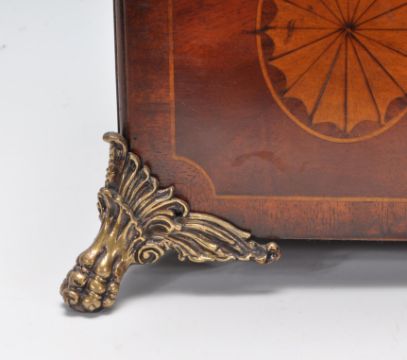 An antique Georgian style late 20th century mahogany casket of rectangular form having a raised cover with inlaid decoration and brass handle atop. The cover lifts off to reveal a hollow interior. Raised on brass paw foot supports. Measures 24cm tall by 32cm wide and 23cm deep