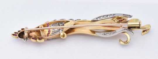 An 18ct gold ruby and diamond figural brooch. The brooch in the form of a bird of paradise set with single cut diamonds and calibre rubies. The trombone clasp verso. French eagle and dog mark to breast. Total weight 11.1g / measures 7cm