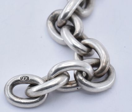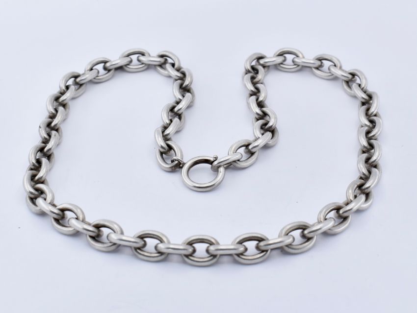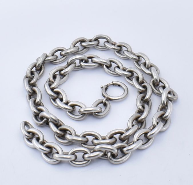 An 800 silver collar necklace chain. The necklace formed of large cable links united by large spring hoop clasp. Marked 800, tests indicate silver. Measures approx 45.5cms. Weight 24.8g.